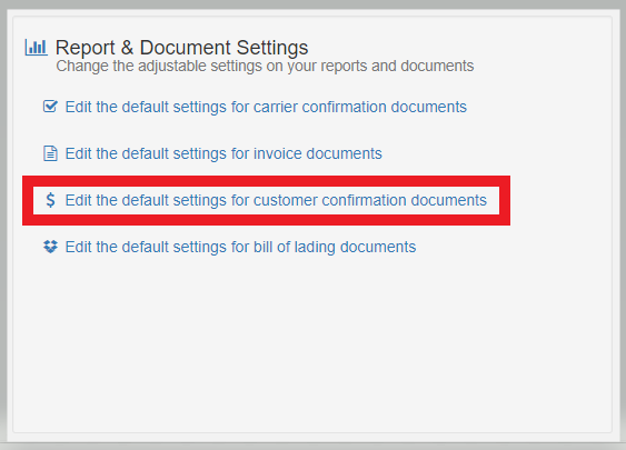 To edit the customer confirmation, you'll click the third option in the Report and Document Settings to the page below: